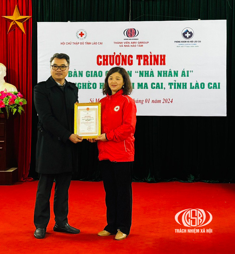 Tại Lễ bàn giao, Hội Chữ thập đỏ Tỉnh đã trao tặng “Bảng ghi nhận tấm lòng vàng nhân đạo” nhằm ghi nhận những đóng góp của Tập đoàn Y tế AMV và những nhà hảo tâm đối với công tác xóa đói giảm nghèo trên địa bàn các xã vùng cao, vùng biên giới nói riêng và các hoạt động an sinh xã hội, chăm sóc, nâng cao sức khỏe của người dân trên địa bàn Tỉnh Lào Cai nói chung mà trong thời gian qua Tập đoàn đã triển khai tổ chức trên địa bàn tỉnh.